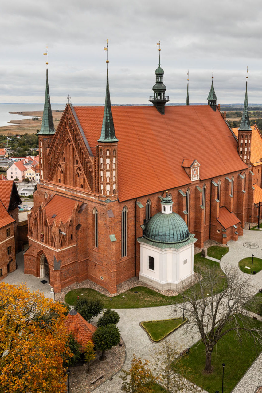 Główne atrakcje Fromborka ulokowane są na Wzgórzu Katedralnym. Odwiedziłem Muzeum Mikołaja Kopernika oraz wszedłem na taras widokowy na wieży Radziejowskiego. W jej dolnej części znajduje się planetarium. Wchodząc spiralnymi schodami na górę, warto zatrzymać się przy wahadle Foucaulta. Prezentowane jest tam proste doświadczenie, które unaocznia nam ruch obrotowy Ziemi. Przy wejściu wystarczy zapamiętać, w jakim fragmencie koła przesuwa się wahadło, a następnie po zejściu można zaobserwować jego przesunięcie. Na wieży zazwyczaj spędza się dłuższą chwilę, ponieważ widok jest imponujący. Panorama roztacza się na wszystkie strony świata. Najciekawsza część to oczywiście ta z bazyliką, w której pochowany jest Mikołaj Kopernik. Za rzędem zabytkowych budynków rozciąga się miasto z wieżą wodną i niewielkim portem.