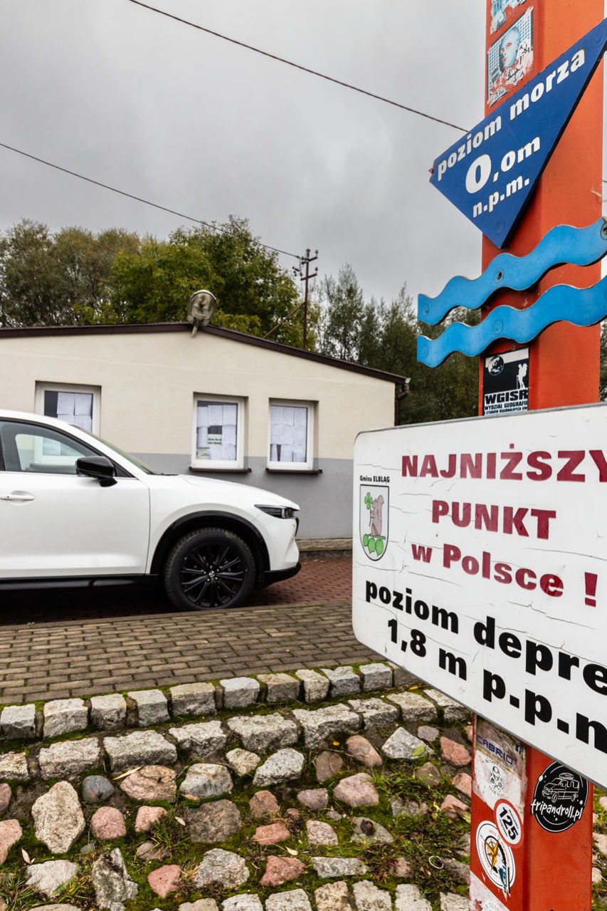 Minąłem miasto i udałem się do Raczek Elbląskich. Już kilka kilometrów przed celem prowadziły mnie tablice informujące o tym, że zbliżam się do najniżej położonego punktu w Polsce. Było tak do 2022 r. Według Małego Rocznika Statystycznego Polski niżej o 40 cm znajduje się inny punkt, całkiem niedaleko Raczek Elbląskich. Z szacunku do dawnej największej depresji w Polsce zatrzymałem się na chwilę przy symbolicznej tablicy, która głosi, że stojący przy niej człowiek znajduje się 1,8 m p.p.m.