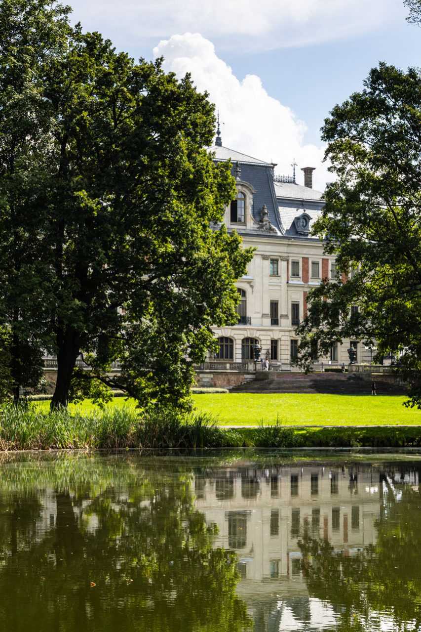 Przeszedłem na drugą stronę drogi i zanurzyłem się w cieniu Parku Zamkowego. Moim celem było oczywiście dojście do dawnej rezydencji magnackiej, ale postanowiłem udać się tam jak najbardziej okrężną drogą. Dzięki temu mogłem podziwiać fasadę z różnych perspektyw. Choć właściwie jest to pałac, przyjęło się nazywać go zamkiem. W miejscu, gdzie obecnie się wznosi, w XV w. stał gotycki zamek obronny, który – jak podają źródła historyczne – również został wybudowany na podwalinach wcześniejszej fortyfikacji. W XVI w. przebudowano go na rezydencję renesansową. Dokonała tego władająca nim rodzina Promnitzów, w której rękach majątek pozostał aż do 1765 r. Budynek został przebudowany na trzykondygnacyjną bryłę na planie nieregularnego czworoboku. W takiej formie przetrwał aż do pożaru w 1679 r. Z biegiem lat pszczyński zamek stał się jedną z najważniejszych rezydencji na Śląsku. W 1734 r. rozpoczęła się jego przebudowa na styl barokowy – w kształcie podkowy, w formie trzech skrzydeł. Dwie kondygnacje przykrył mansardowy dach. Właścicielami Pszczyny został ród Anhalt Köthen-Pless, który władał nią do 1846 r. Za ich czasów zwierzyniec zamieniono w park, a w pobliżu pojawiło się kilka nowych budowli, m.in. klasycystyczny dwór Ludwikówka na skraju parku.