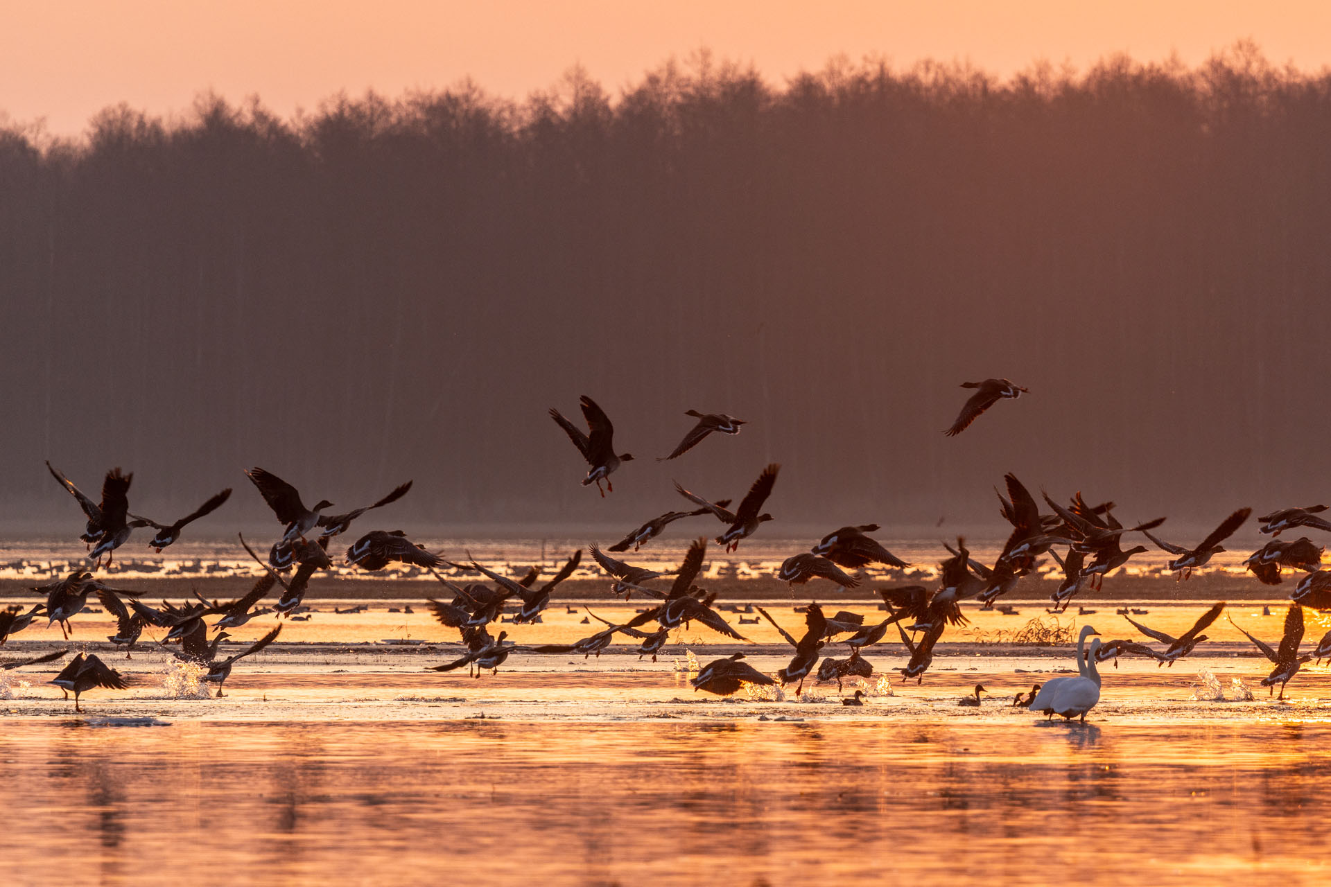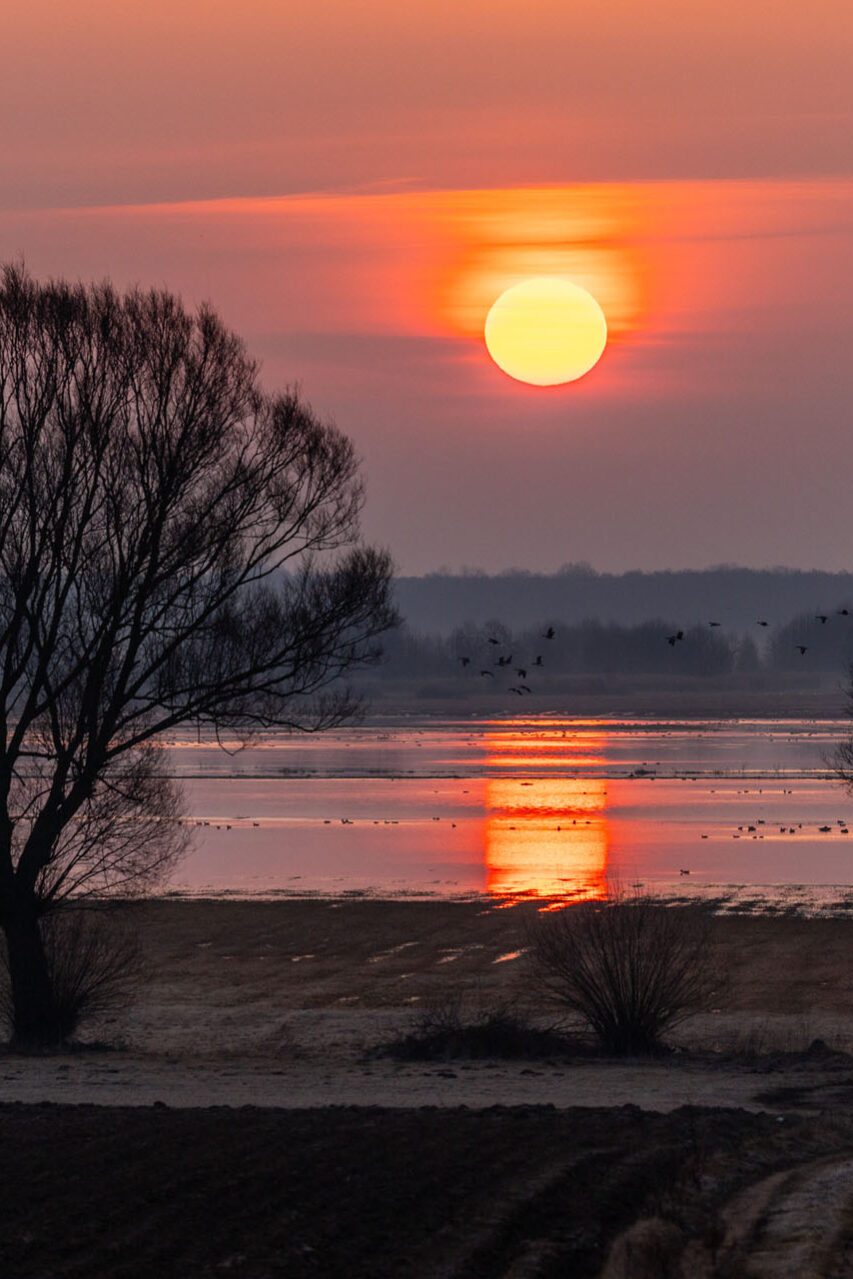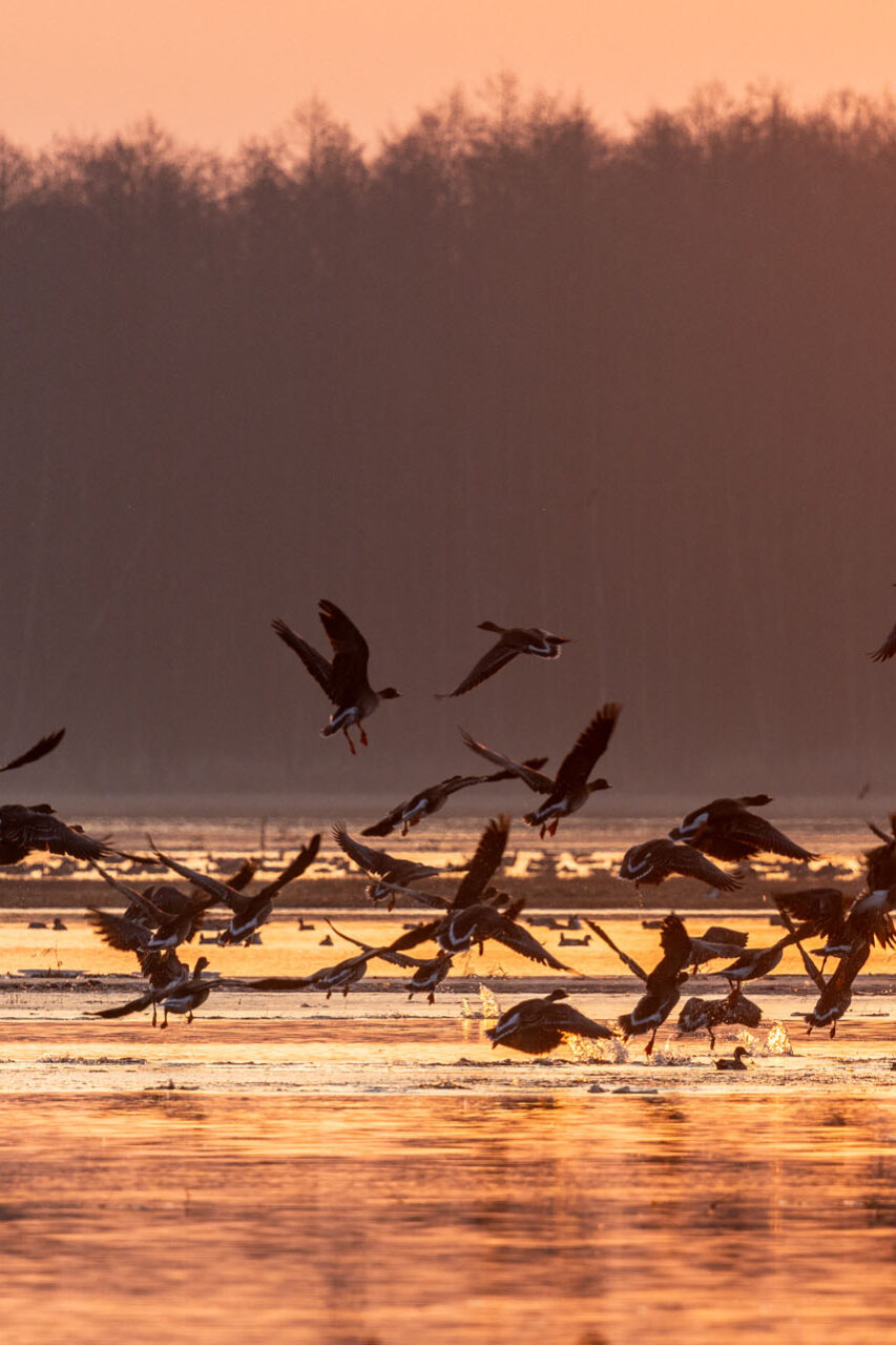 W dolnym basenie Biebrzy, na odcinku od Wizny do Radziłowa, nocowały tysiące ptaków. Kiedy słońce pojawia się nad rozlewiskami, rozpoczyna się niezwykłe przedstawienie. Całe stada podrywają się do lotu i ruszają na okoliczne pola. Dzieje się to niemal automatycznie – jakby ktoś nacisnął magiczny guzik i startował kolejne grupy. Początkowo ruszają chaotycznie, robiąc niesamowity rejwach, ale gdy tylko wzbiją się wyżej, formują kształtny klucz i znikają hen, nad polami. Obserwowałem to z brzegu rzeki w Brzostowie. Stałem tam dobre pół godziny, niczym zahipnotyzowany patrząc, jak tysiące gęsi rozpoczynają swój dzień. Gdy wróciłem tam tydzień później o wschodzie słońca, nie zastałem już nic poza ciszą i pustką ziejącą z przepastnych rozlewisk.