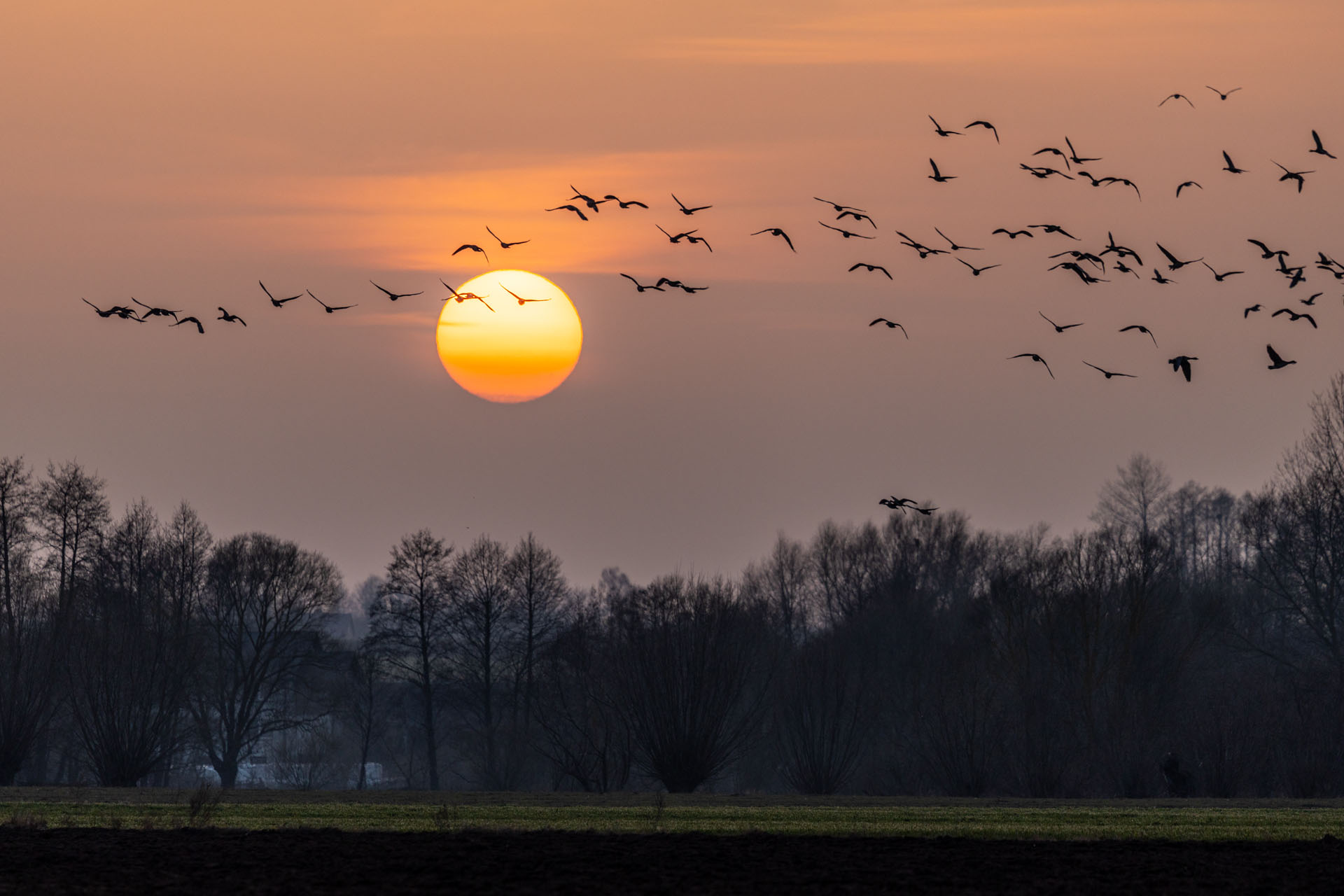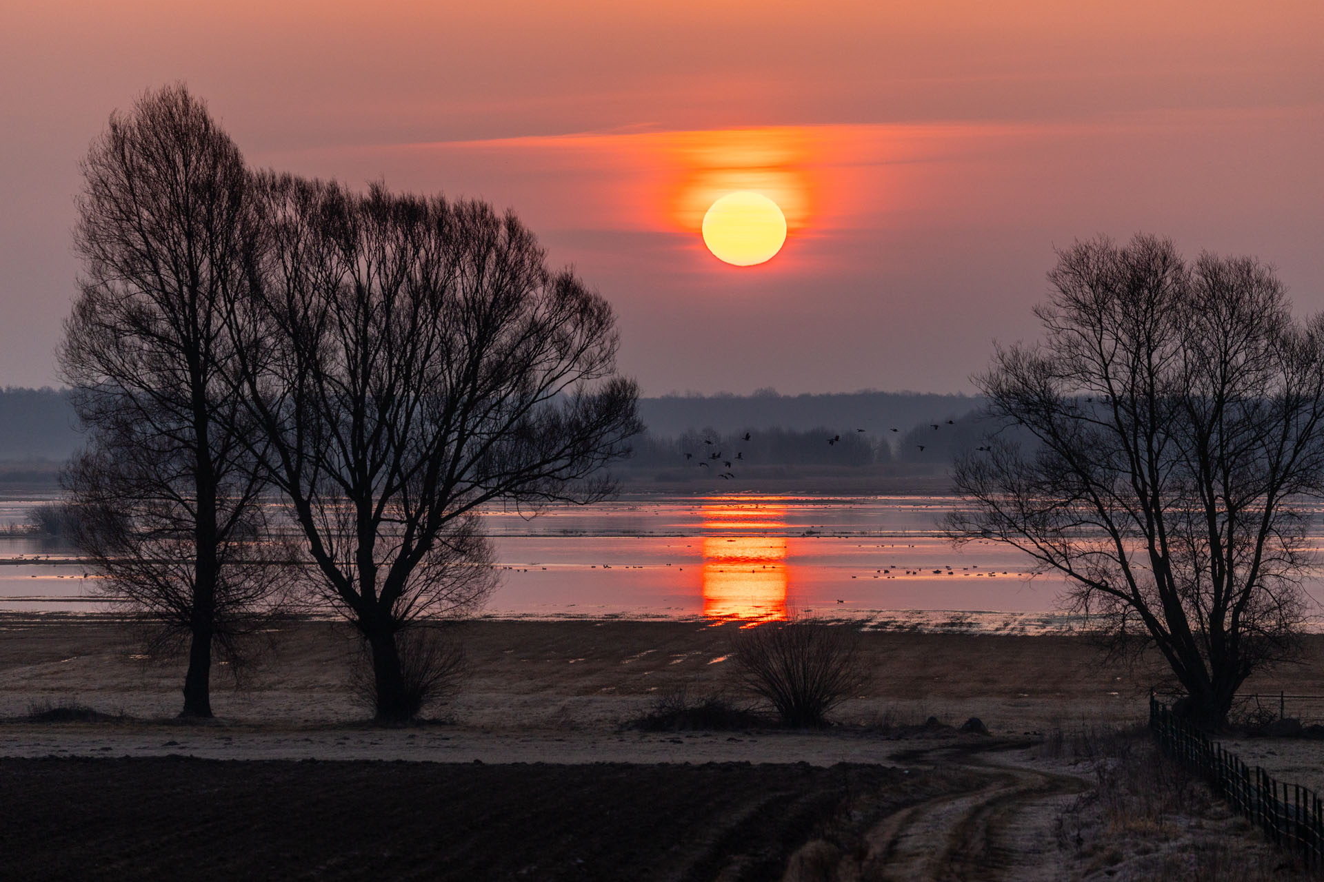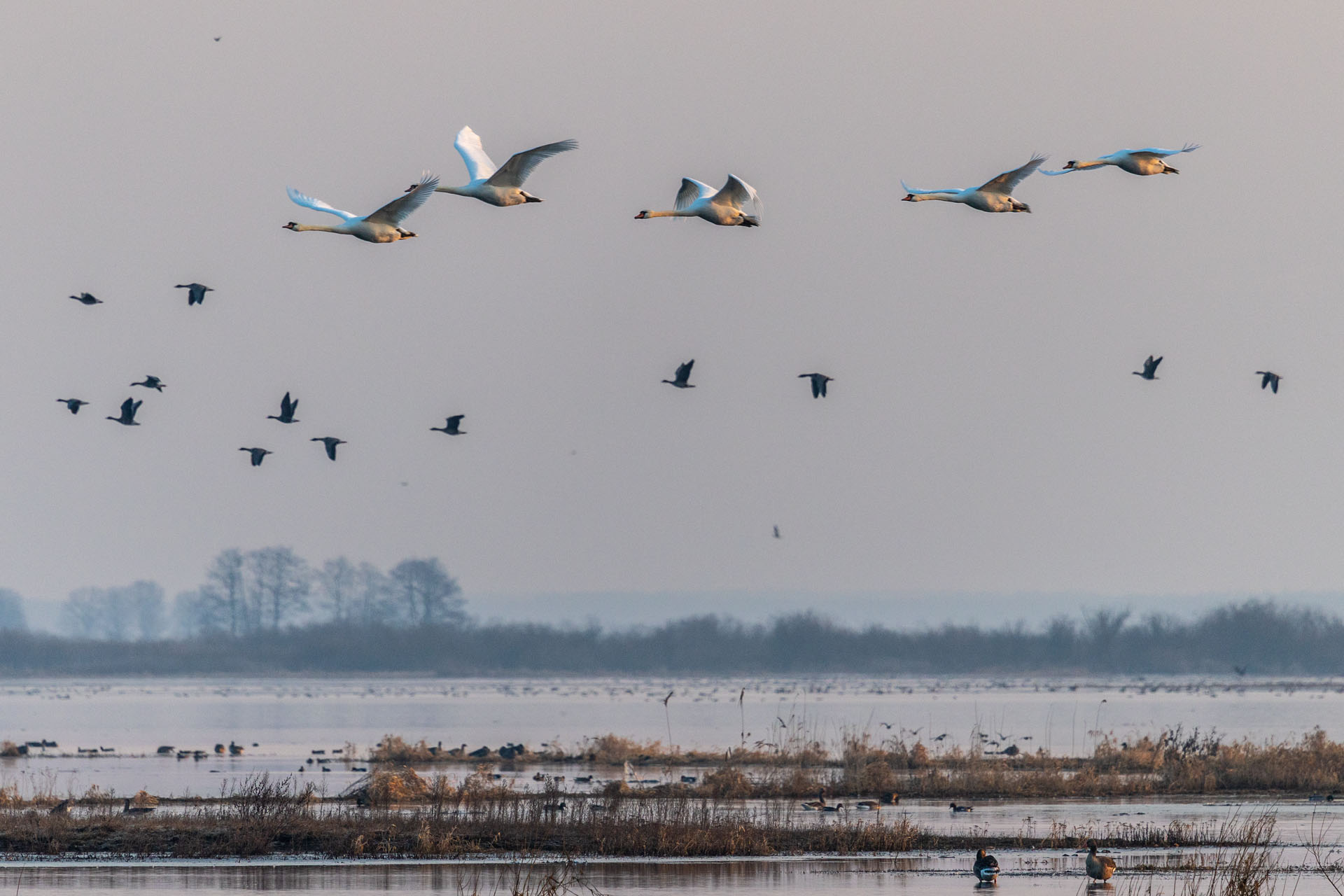 W dolnym basenie Biebrzy, na odcinku od Wizny do Radziłowa, nocowały tysiące ptaków. Kiedy słońce pojawia się nad rozlewiskami, rozpoczyna się niezwykłe przedstawienie. Całe stada podrywają się do lotu i ruszają na okoliczne pola. Dzieje się to niemal automatycznie – jakby ktoś nacisnął magiczny guzik i startował kolejne grupy. Początkowo ruszają chaotycznie, robiąc niesamowity rejwach, ale gdy tylko wzbiją się wyżej, formują kształtny klucz i znikają hen, nad polami. Obserwowałem to z brzegu rzeki w Brzostowie. Stałem tam dobre pół godziny, niczym zahipnotyzowany patrząc, jak tysiące gęsi rozpoczynają swój dzień. Gdy wróciłem tam tydzień później o wschodzie słońca, nie zastałem już nic poza ciszą i pustką ziejącą z przepastnych rozlewisk.