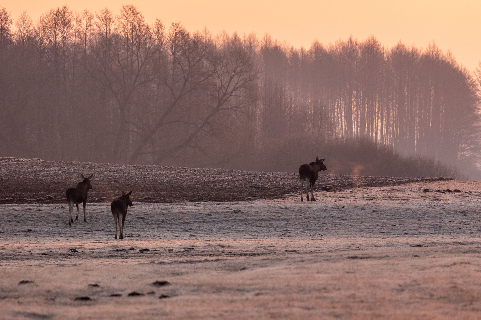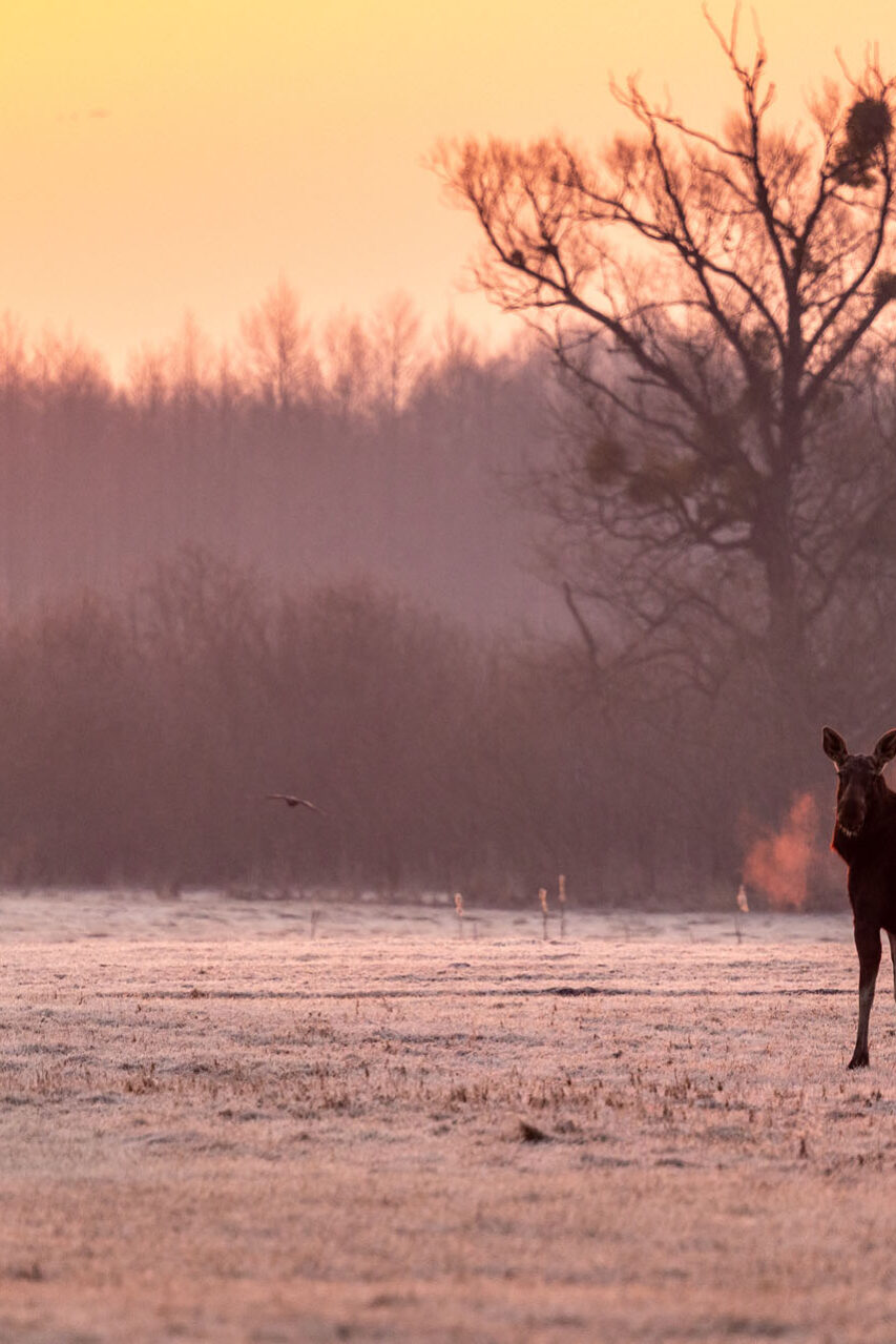 Ostatni poranek mojej podróży spędziłem w terenie. Wstałem chwilę przed piątą, więc gdy pierwsze promienie słońca zaczęły zalewać dolinę Biebrzy, byłem już kawałek za Brzostowem. Nagle, z niewielkiej kępy drzew między asfaltem a wsią, wyszły trzy łosie. Dumnie wędrowały wprost ku słońcu. Stałem i fotografowałem tę scenę, całkowicie zauroczony tym, co widzę.