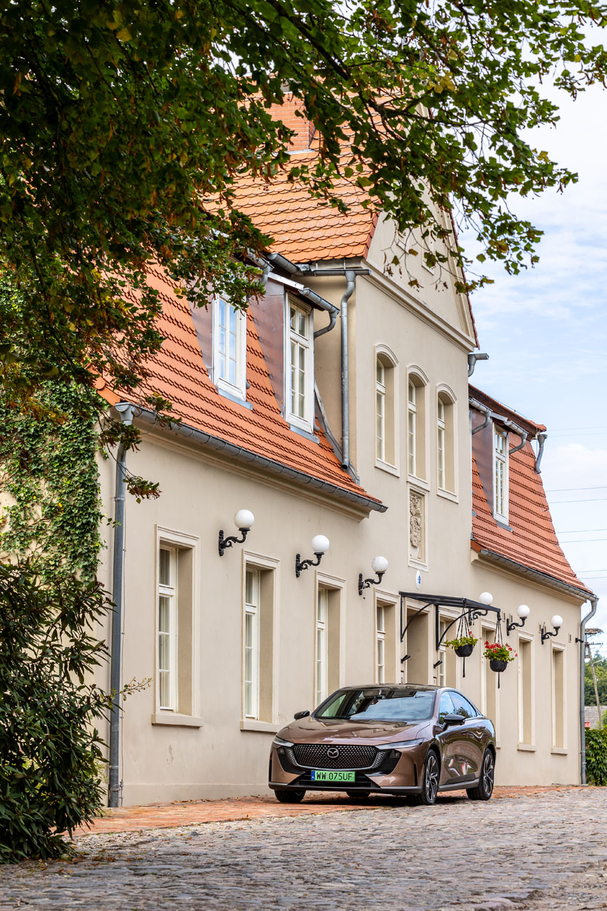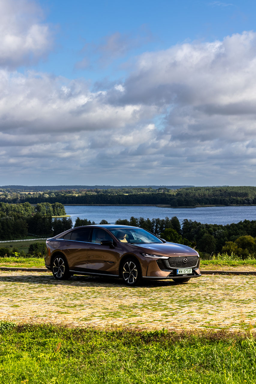 Rytmiczny dźwięk kierunkowskazu zwiastował zjazd z autostrady A2. Właśnie w ten sposób Mazda 6e i ja kończyliśmy nasz początkowy etap podróży z Warszawy do Krainy 100 Jezior. Była to moja pierwsza tak daleka trasa elektrykiem, więc z wielkim zainteresowaniem obserwowałem zasięg i zużycie energii. Ku mojemu zaskoczeniu, wszystko odbyło się niemal katalogowo – po pokonaniu prawie 360 km miałem jeszcze spory zapas zasięgu na wycieczki po okolicy.
