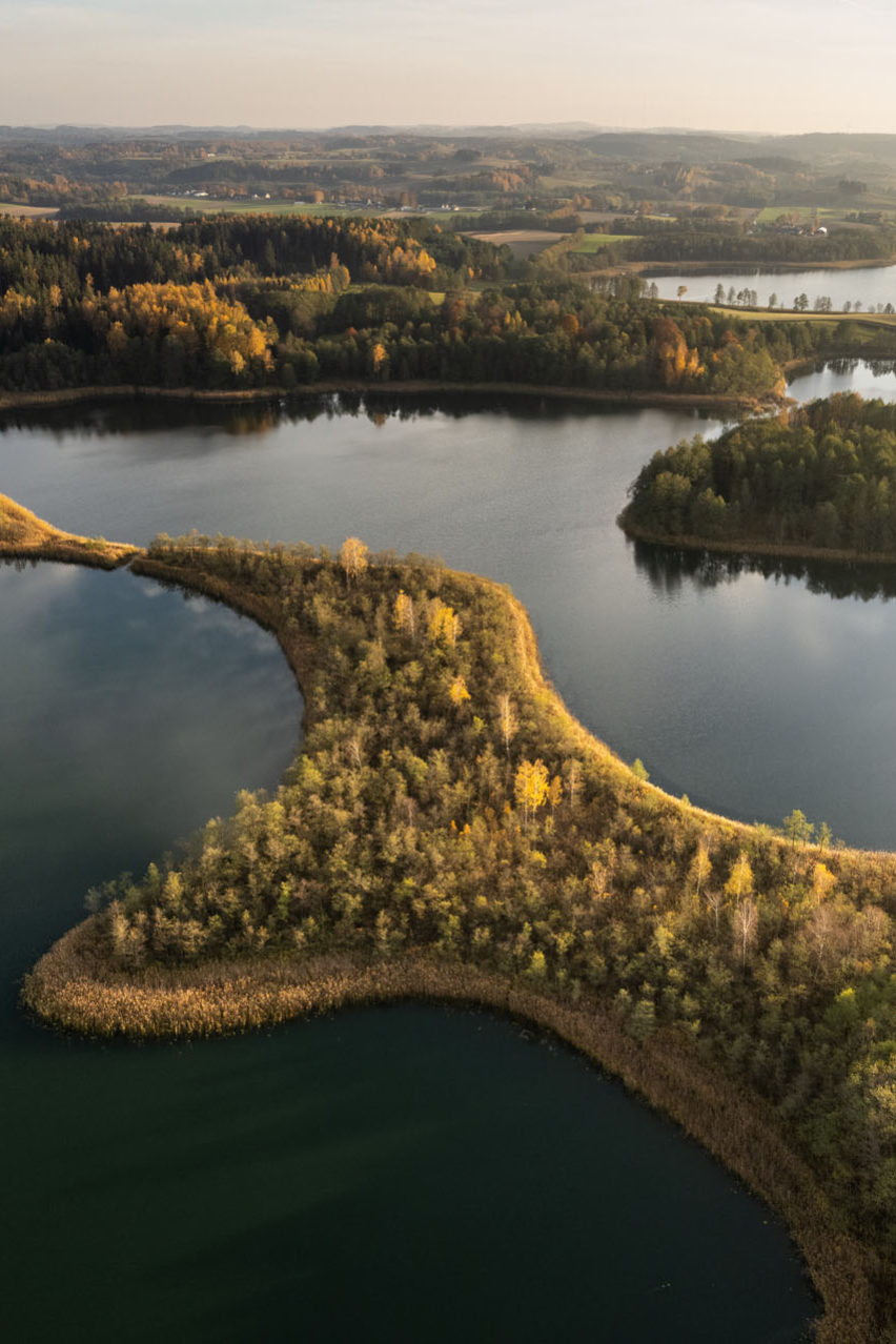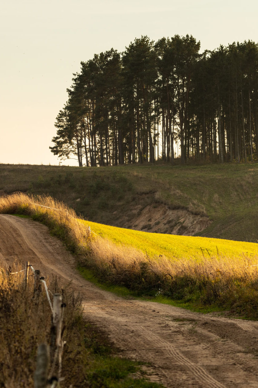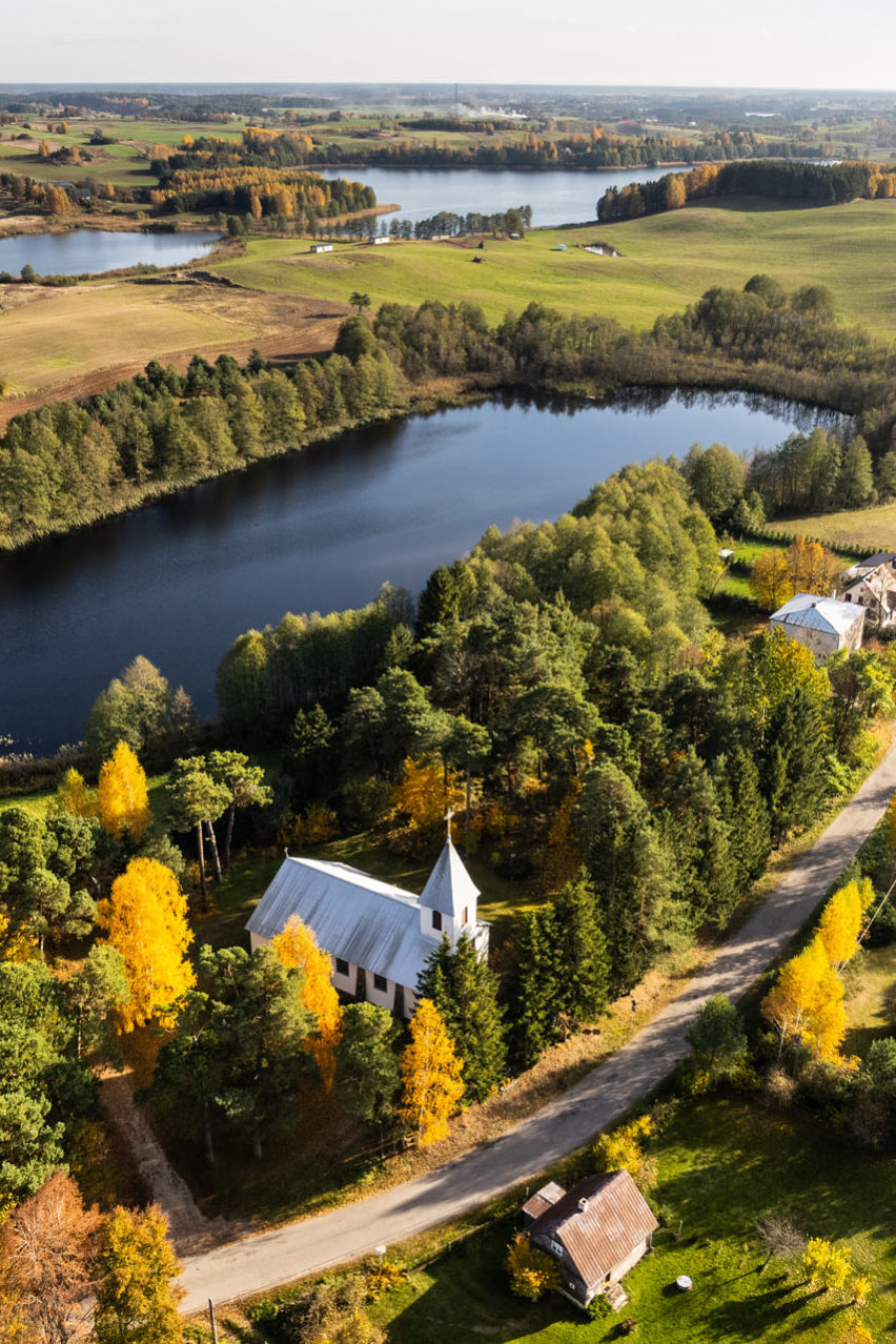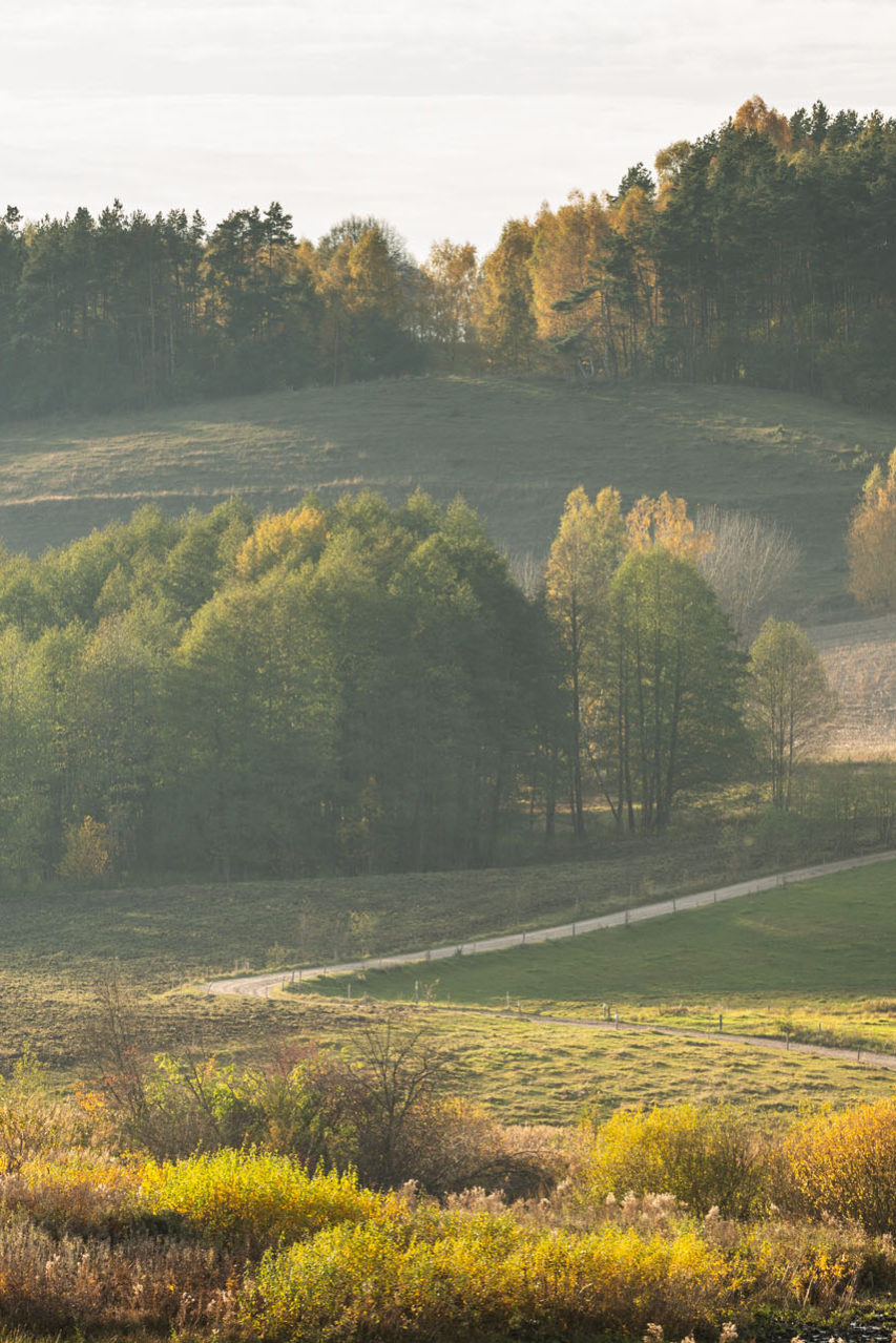 Nazwa jeziora Gaładuś zapadła mi w pamięć. Zatrzymałem się na chwilę, żeby spojrzeć na jego rozległą taflę ze wsi Żegary. Niestety, jak to bywa w przypadku tego typu miejsc, trudno znaleźć legalne dojście do brzegu. Widok Gaładusia wzbudził we mnie tęsknotę za Suwalskim Parkiem Krajobrazowym. Miałem do wyboru niepewny plan jazdy wzdłuż granicy na północ albo dobrze znane zakątki w okolicach Wodziłek. Serce ciągnęło ku nowemu, ale rozum podpowiadał, że przy tak krótkich dniach lepiej wybrać miejsca, w których nie będę błądził. Skierowałem się więc przez Sejny do Jeleniewa. Po drodze przejechałem przez zupełnie nieznany mi teren, który co rusz zachwycał kształtami łagodnych polodowcowych pagórków. Minąłem Jeleniewo i po kilku kilometrach zjechałem z asfaltu na drogę szutrową. Wodziłki, jak zwykle, pojawiły się za zakrętem bez zapowiedzi. Skąpane w kolorach złotej jesieni wyglądały bosko. Zawsze, kiedy jestem w tym miejscu, przystaję na chwilę przy molennie. Jest to dom modlitwy bezpopowców (Wschodni Kościół Staroobrzędowy, odłam prawosławia). Chociaż budynek wyglądem przypomina cerkiew, to nie odbywają się w nim obrzędy liturgiczne z udziałem kapłana, a odprawiane są nabożeństwa. Obecnie w Polsce odnaleźć można cztery molenny staroobrzędowców. Świątynię w Wodziłkach wybudowano w 1921 r. Całe jej otoczenie wygląda niczym przedsionek końca świata. Osada położona jest na wzniesieniu, ale otaczają ją wyższe tereny, przez co jest tam wyjątkowo pięknie, ponieważ pola łagodnie opadają, a następnie stromo wznoszą się ku niebu. O tej porze roku nie miałem obaw o stan drogi do Łopuchowa. Przełączyłem mazdę CX-5 w tryb off road i ruszyłem szutrówką wśród pól ku suwalskim bezkresom. Uwielbiam ten fragment drogi i uważam, że jest to jeden z najpiękniejszych odcinków w regionie. Liczy kilka kilometrów, ale pozwala zobaczyć urodę tego miejsca w pigułce.
