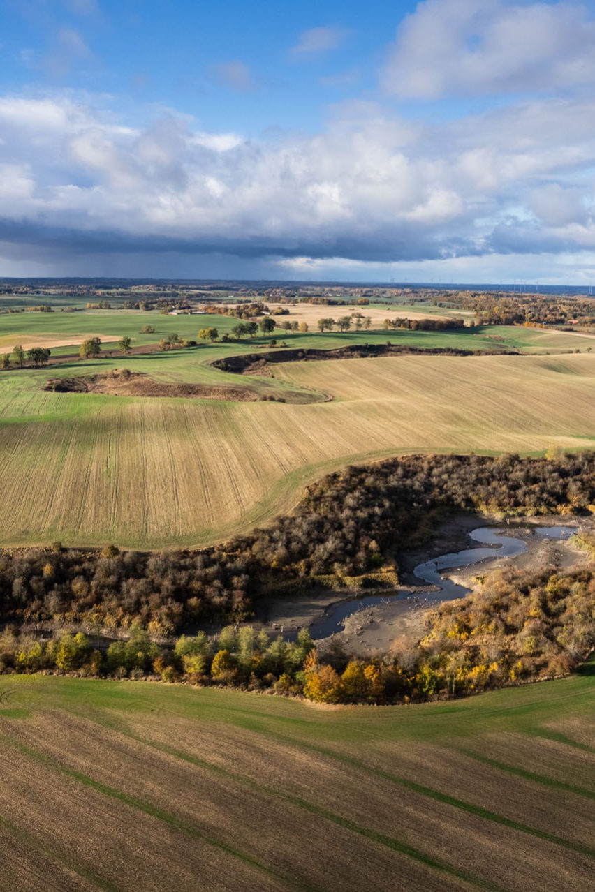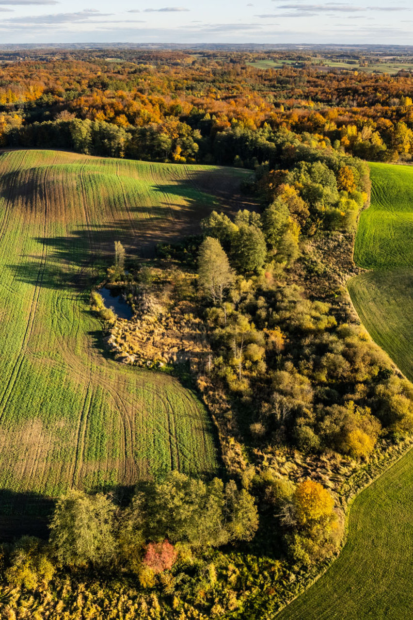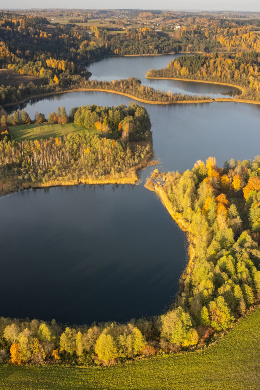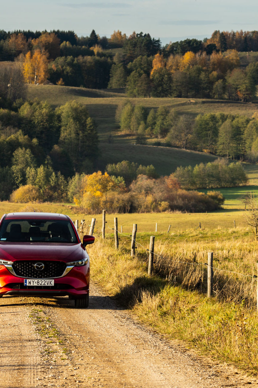 Nazwa jeziora Gaładuś zapadła mi w pamięć. Zatrzymałem się na chwilę, żeby spojrzeć na jego rozległą taflę ze wsi Żegary. Niestety, jak to bywa w przypadku tego typu miejsc, trudno znaleźć legalne dojście do brzegu. Widok Gaładusia wzbudził we mnie tęsknotę za Suwalskim Parkiem Krajobrazowym. Miałem do wyboru niepewny plan jazdy wzdłuż granicy na północ albo dobrze znane zakątki w okolicach Wodziłek. Serce ciągnęło ku nowemu, ale rozum podpowiadał, że przy tak krótkich dniach lepiej wybrać miejsca, w których nie będę błądził. Skierowałem się więc przez Sejny do Jeleniewa. Po drodze przejechałem przez zupełnie nieznany mi teren, który co rusz zachwycał kształtami łagodnych polodowcowych pagórków. Minąłem Jeleniewo i po kilku kilometrach zjechałem z asfaltu na drogę szutrową. Wodziłki, jak zwykle, pojawiły się za zakrętem bez zapowiedzi. Skąpane w kolorach złotej jesieni wyglądały bosko. Zawsze, kiedy jestem w tym miejscu, przystaję na chwilę przy molennie. Jest to dom modlitwy bezpopowców (Wschodni Kościół Staroobrzędowy, odłam prawosławia). Chociaż budynek wyglądem przypomina cerkiew, to nie odbywają się w nim obrzędy liturgiczne z udziałem kapłana, a odprawiane są nabożeństwa. Obecnie w Polsce odnaleźć można cztery molenny staroobrzędowców. Świątynię w Wodziłkach wybudowano w 1921 r. Całe jej otoczenie wygląda niczym przedsionek końca świata. Osada położona jest na wzniesieniu, ale otaczają ją wyższe tereny, przez co jest tam wyjątkowo pięknie, ponieważ pola łagodnie opadają, a następnie stromo wznoszą się ku niebu. O tej porze roku nie miałem obaw o stan drogi do Łopuchowa. Przełączyłem mazdę CX-5 w tryb off road i ruszyłem szutrówką wśród pól ku suwalskim bezkresom. Uwielbiam ten fragment drogi i uważam, że jest to jeden z najpiękniejszych odcinków w regionie. Liczy kilka kilometrów, ale pozwala zobaczyć urodę tego miejsca w pigułce.