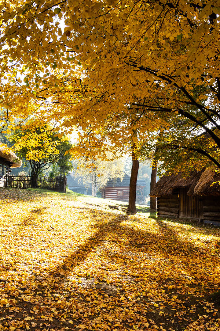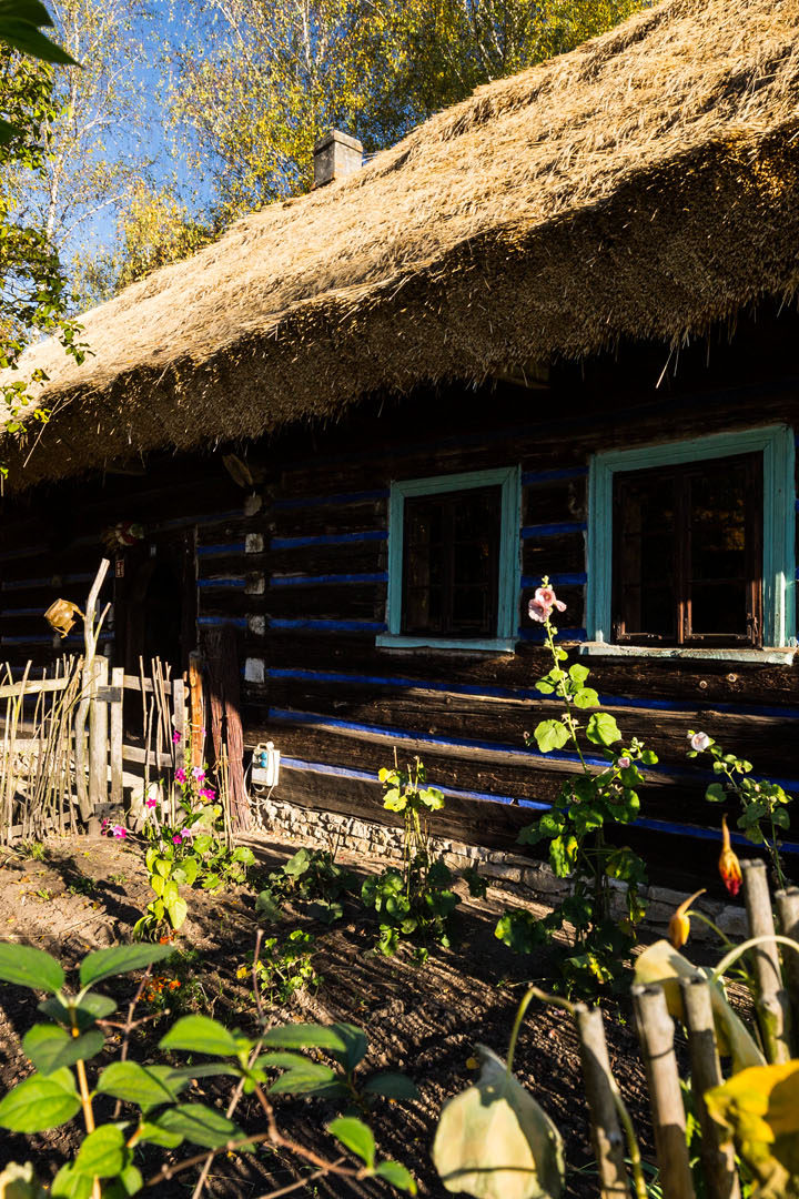 Nadwiślański Park Etnograficzny w Wygiełzowie prezentuje świat Krakowiaków Zachodnich. Obiektów nie ma wiele, a teren nie jest rozległy, dlatego zwiedzanie jest naprawdę przyjemne. Najbardziej spodobała mi się chałupa z Podolsza i stojąca tuż obok niej ośmioboczna stodoła z Przeciszowa pochodząca z 2 poł. XIX w. Podziwiałem je w porannym słońcu wśród złotych liści i przez moment poczułem, jakbym odbył podróż w czasie. Z tego letargu wybudziły mnie brutalnie odgłosy szkolnej wycieczki, więc postanowiłem jechać dalej.