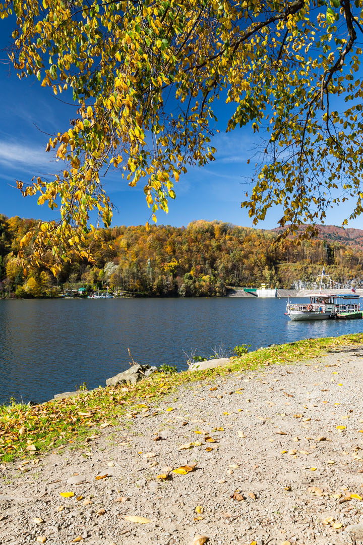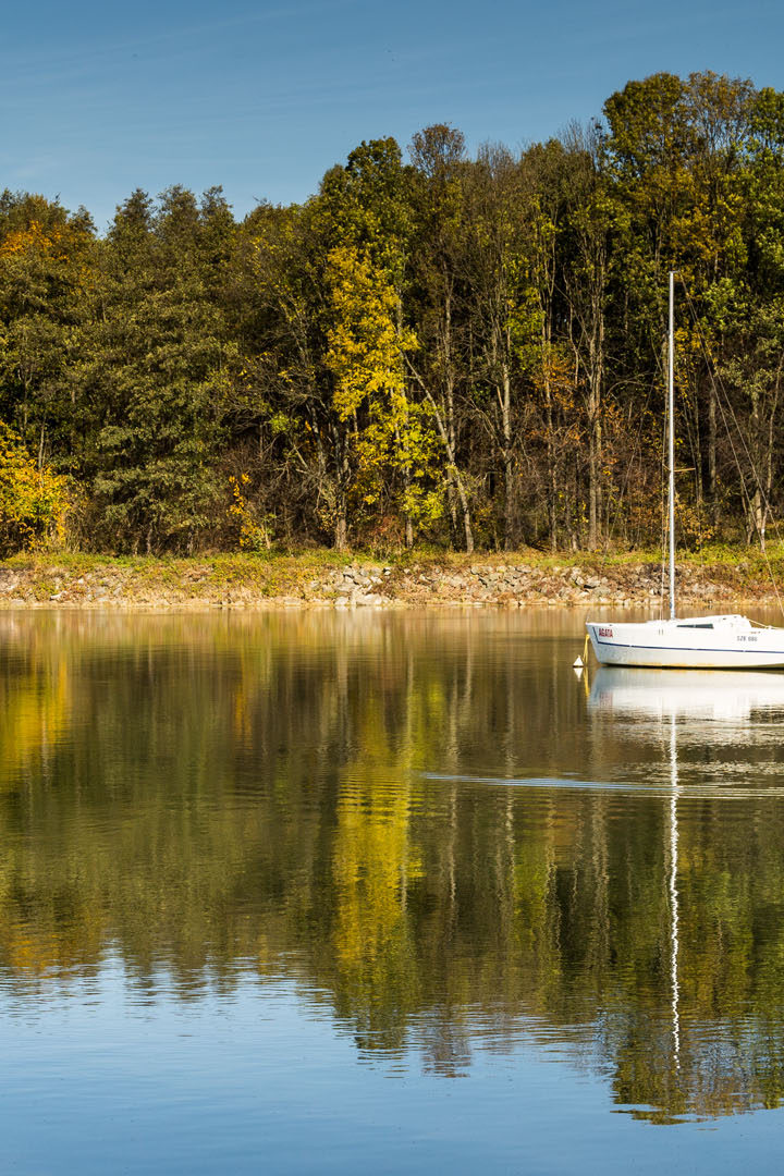 Zjechałem z powrotem do auta i udałem się nad Jezioro Żywieckie. Pierwszy postój zrobiłem przy zaporze w Tresnej. Tuż obok niej znajduje się przestronny parking. Poszedłem nieco wzdłuż brzegu w kierunku Zatoczki Kańczuga. Drugim przystankiem była plaża miejska w Żywcu obok Ośrodka Szkolenia Żeglarskiego Politechniki Krakowskiej. Choć jezioro jest duże, to nie ma wcale zbyt wielu miejsc, w których można spacerować jego brzegiem. Podobny problem występuje choćby na Mazurach czy Kaszubach, gdzie jeziora podziwiać można co najwyżej zza płotu. Na szczęście dwa wspomniane punkty nad Jeziorem Żywieckim są bardzo malownicze. Będąc na miejskiej plaży, koniecznie obejdźcie cypel i spójrzcie na odbijające się w tafli wody Skrzyczne.