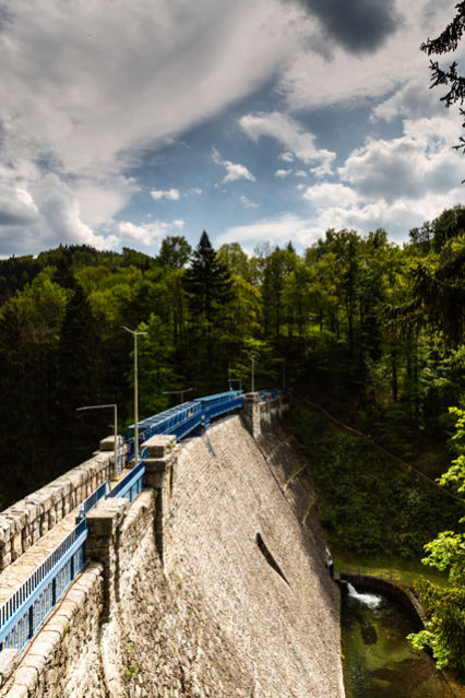 Kolejną zaporę na Kwisie znalazłem nad Jeziorem Złotnickim. Droga z parkingu prowadzi przez wykute w skale tunele. Dookoła panuje bardzo specyficzny klimat – natura bardzo płynnie przenika się z techniką. Z korony zapory można dostrzec budynek elektrowni wodnej. Warto wybrać się na dłuższy spacer wzdłuż brzegu jeziora. Jest otoczone ze wszystkich stron polami i lasem, przez co panuje tam błogi spokój.