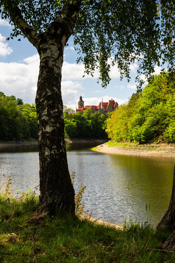 Wróciłem na szosę do Suchej i po chwili zaparkowałem na jednym z dwóch bezpłatnych postoi przy zamku Czocha. Obejrzałem go z bliska, a potem zapragnąłem spojrzeć na niego z jeszcze innej perspektywy i pojechałem dalej w kierunku Gryfowa Śląskiego i po wyjechaniu zza linii drzew skręciłem w szutrową drogę w lewo. Prowadzi ona do przystani żeglarskiej Izery. To właśnie z tego punktu, w otoczeniu lasu i nad taflą Jeziora Leśniańskiego, moim zdaniem zamek wygląda najbardziej atrakcyjnie.
