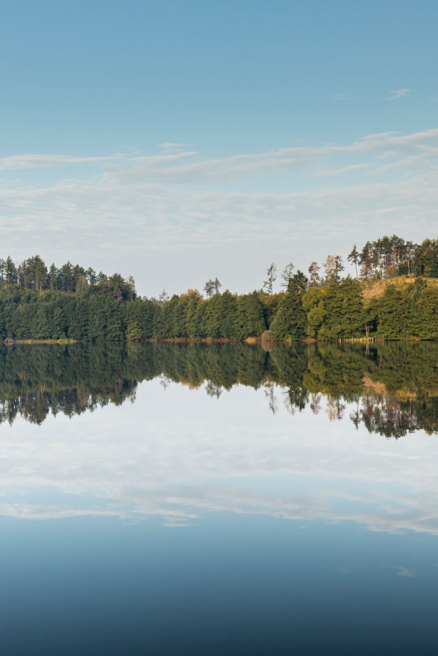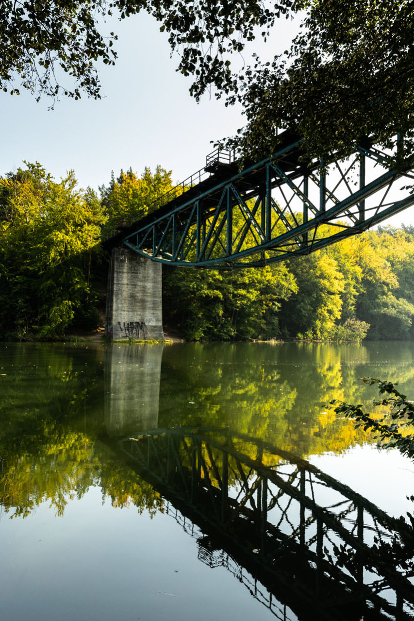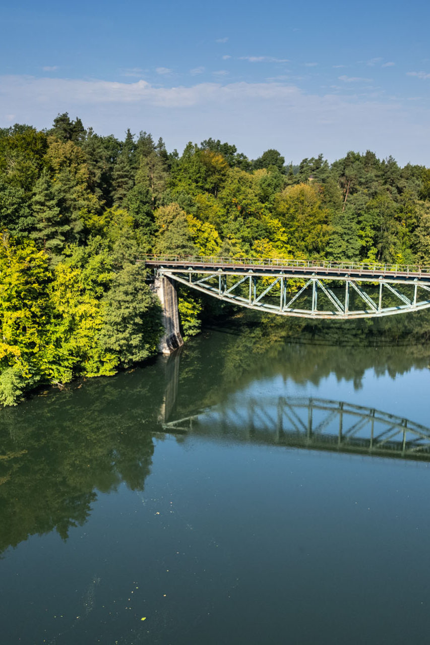 Z Będomina przedostałem się do drogi nr 20, którą opuściłem za Szymbarkiem, skręcając w kierunku Chmielna i Kościerzyny. Przemknąłem jedną z najbardziej malowniczych dróg na Kaszubach, biegnącą wzdłuż jezior: Ostrzyckiego, Brodno Wielkie, Brodno Małe i Kłodno. Kartuzy minąłem bez przystanku, podobnie jak Kościerzynę, i pojechałem nad rzekę Radunię w okolicach Elektrowni Wodnej Rutki. Od wielu lat chciałem zobaczyć malowniczo położony most kolejowy, który stoi nad wodami zatrzymanej rzeki. Chcąc do niego dotrzeć, trzeba zaparkować nieopodal i przejść niebieskim szlakiem, który omija teren elektrowni, co początkowo zdaje się prowadzić w przeciwnym kierunku. Ostatecznie jednak wiedzie do wąskiej ścieżki biegnącej brzegiem szeroko rozlanej Raduni. Most prezentuje się bardzo ciekawie. Jest nadal używany i jeżdżą po nim pociągi, więc bezpiecznie jest podziwiać go z perspektywy szlaku.