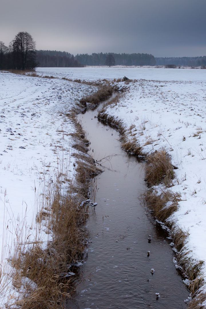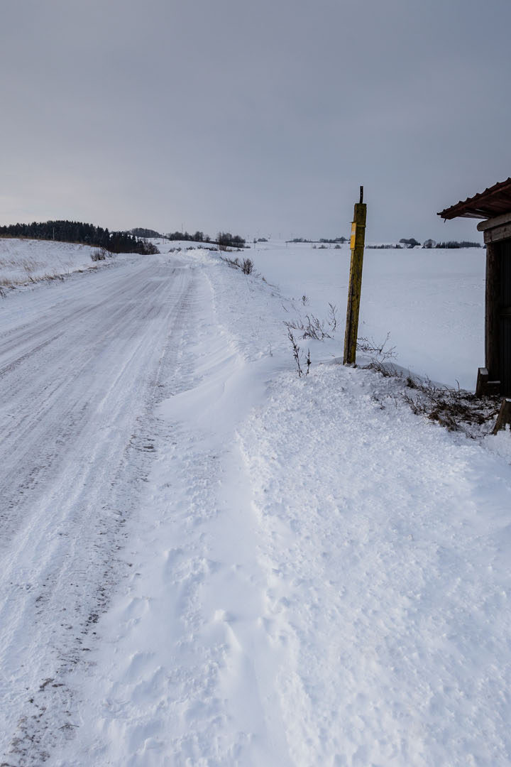 Po spacerze przy mostach ruszyłem dalej drogą nr 651 w kierunku Wiżajn. Przeszedłszy piękny kawałek Puszczy Romnickiej, dojechałem do trójstyku granic. Linia dzieląca Rosję, Litwę i Polskę znajduje się około 500 metrów od parkingu. Następnie dotarłem do Wiżajn, gdzie opuściłem główną drogę i udałem się do Ejszeryszek. Za tym małym miasteczkiem można poczuć się jak na końcu świata. Rozsiane po polach gospodarstwa są jedynymi śladami działalności człowieka. Zima w tych okolicach jest magiczna. Zachęcam do pojeżdżenia (jeśli szosy będą przejezdne) różnymi bocznymi drogami, które często prowadzą donikąd. Otaczają je niezwykłe krajobrazy.