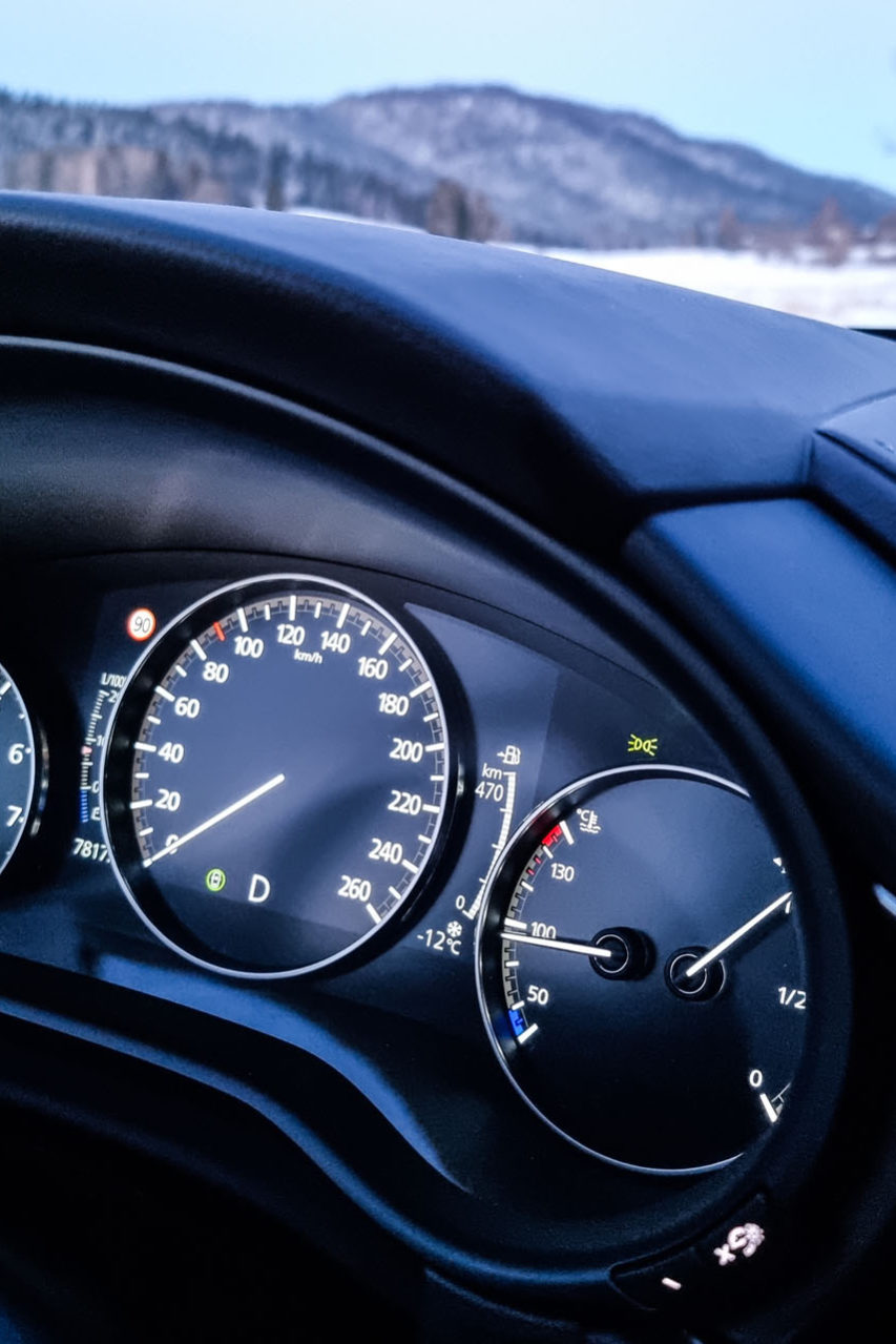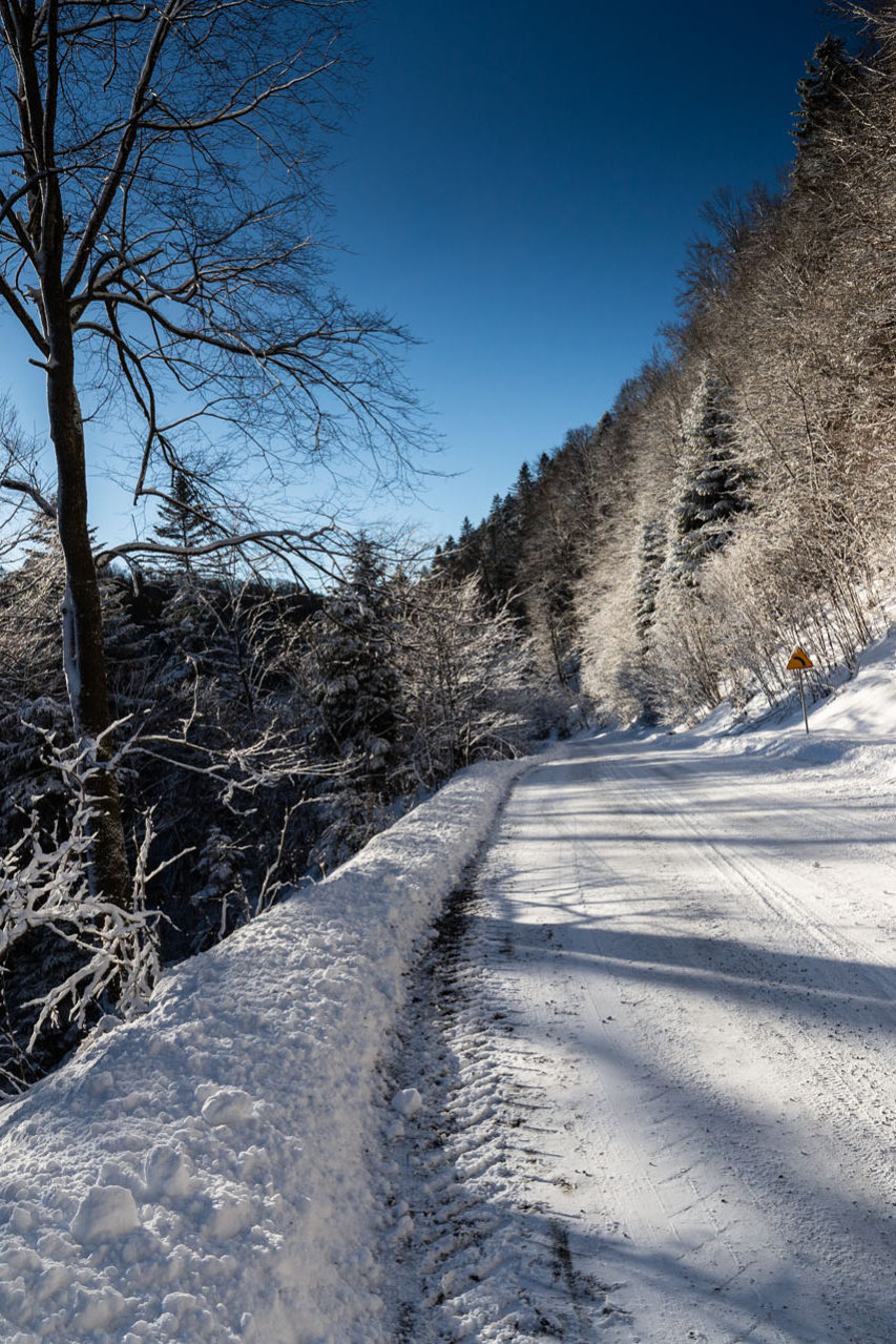 Było już ciemno, ale podskórnie czułem, że kolejny dzień, na który prognozowano – 12 st.C będzie bajkowy. Drogi z bardzo śliskich przeszły w stan… trudny do sklasyfikowania. Auta bez napędu 4×4 nie radziły sobie na najmniejszych wzniesieniach. Mazda CX-30 kolejny raz uratowała mi skórę, bo bezpiecznie dotarłem do „Gęsiego Zakrętu”. Kolejnego dnia wstałem grubo przed wschodem słońca, bo zakładałem, że drogi będą nadal w fatalnym stanie. Nie pomyliłem się. Dojazd do Lutowisk zajął mi prawie dwa razy więcej czasu niż normalnie. Przed odjazdem przygotowałem sobie łańcuchy na koła, bo byłem przekonany, że będą potrzebne. Wszystkim, którzy wybierają się z zimą w Bieszczady, polecam zabrać ze sobą łańcuchy. Warunki na drogach bywają bardzo zmienne i niebezpieczne. Mnie sama świadomość, że je mam, dodawała otuchy, choć okazało się, że tym razem nie były potrzebne. Mazda dała radę!