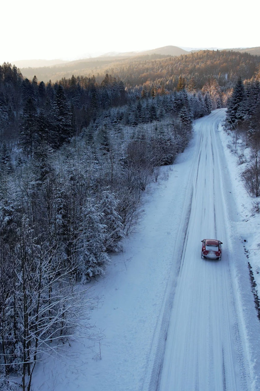 Zrobiło się dość późno jak na zimową porę, bo już po 15.00 powoli zapada zmrok. Z Sanoka pojechałem w stronę Komańczy i zanim udałem się w Bieszczady, postanowiłem zajrzeć do Moniki i Piotra w „Chacie nad Wisłokiem”. Ich agroturystyka mieści się w starej łemkowskiej chacie, a obok niej szczęśliwi uciekinierzy z miasta prowadzą ekologiczne gospodarstwo rolne. Dom odkupiony został w ostatnim momencie od wiekowego właściciela i nie podzielił smutnego losu wielu drewnianych chat. Zyskał za to drugie życie i pomimo wykonanych prac usprawniających życie i podnoszących komfort, nie stracił swojego charakteru. Ogromnym plusem zimy jest to, że gospodarze mają chwilę wytchnienia i można z nimi spokojnie porozmawiać. Siedliśmy więc przy herbacie z kwiatów jabłoni i najzwyczajniej w świecie rozmawialiśmy. Doświadczyłem tam pięknej chwili uważności. Rano ruszyłem w dalszą podróż. O ile dzień wcześniej padał deszcz, o tyle tego dnia lał już niemiłosiernie. Prognozy mówiły jednak o ochłodzeniu i śniegu, więc nie porzucałem nadziei. Postanowiłem odpalić dobrą muzykę i niespiesznie przejechać moją własną pętlę bieszczadzką. Swój początek ma w Komańczy, dalej biegnie do Cisnej, skręca w stronę Baligrodu, później przez Stężnicę przechodzi nad Jezioro Solińskie w Wołkowyi. Jadąc dalej na południe, w Bukowcu trzeba wjechać na drogę prowadzącą przez Terkę, Buk do Dołżycy. Wiem, że na mapie wygląda to jak absurdalne nadłożenie drogi, ale zapewniam wszystkich miłośników czterech kółek, że trasa, którą opisałem, zapewnia maksimum wrażeń i radości z jazdy. Do pokonania są brody na potokach, które tym razem były wypełnione wodą. Frajda z takiej przygody jest niezapomniana. Z Dołżycy kieruję się oczywiście do Wetliny. Moja ukochana „Chata Wędrowca” o tej porze roku jest zamknięta, ale udało mi się spotkać z jej właścicielami, Ewą i Robertem, na kawie w ich nowo powstałej „Trzynastce”. Moim zdaniem ta kawiarnia położona w cichym zakątku Wetliny będzie oferowała najlepszą kawę w Bieszczadach. Sam mogłem się przekonać o tym, ile pracy Ewa włożyła w zdobycie umiejętności baristycznych, bo po pierwszym łyku kawy, którą mi przygotowała, na długo zaniemówiłem z zachwytu. Kolejny raz w tej podróży zastała mnie noc, ale nie zrezygnowałem z kontynuowania trasy. Była przecież 17.00. Przeczuwając, że internet na tym terenie lada moment zniknie, ściągnąłem muzykę offline i ruszyłem przez Przełęcz Wyżną do Brzegów Górnych. Tam skręciłem w kierunku Dwernika. Pokonałem San moim ulubionym drewnianym mostem, dojechałem do Smolnika i udałem się drogą nr 896 do Zadwórza. Tam zamieszkałem przez kilka dni w „Gęsim Zakręcie”. Anię i Pawła poznałem w czasie pierwszej slowroadowej podróży w Bieszczady i bardzo chętnie skorzystałem z ich przytulnych pokoi i wyśmienitej kuchni. Ale co z tą zimą? Ta miała objawić się dopiero rano.