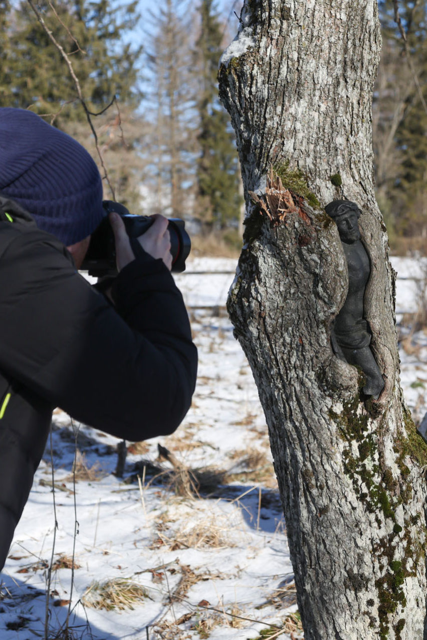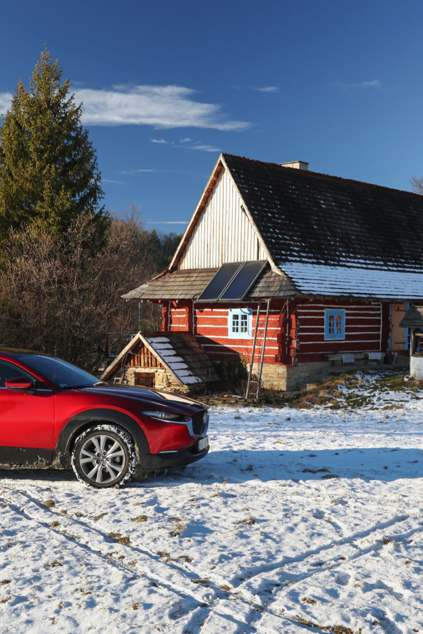 Tego ranka za cel mojej podróży obrałem Tarnawę Niżną. To dziki zakątek Bieszczadów. Wędrowcy zazwyczaj docierają do Mucznego, skąd wychodzi popularny szlak na Bukowe Berdo. Ja pojechałem do końca, dokąd tylko dało się dojechać. Chciałem dotrzeć do punktu widokowego nad Sanem, z którego widać cerkiew po ukraińskiej stronie. Niestety świeże opady śniegu sprawiły, że droga nagle urwała się w takim miejscu, że nie chciałem ryzykować utknięciem w zaspie, skąd po najbliższą pomoc musiałbym wędrować kilka kilometrów. Zawróciłem więc na wysokości Torfowiska Tarnawa i delektując się widokami pięknych lasów, przez Muczne dotarłem do głównej drogi. Był to dzień, w którym opuszczałem Bieszczady, więc postanowiłem nacieszyć się nimi, ile tylko się da. Zatrzymałem się na chwilę przy pięknie ośnieżonej dawnej cerkwi w Smolniku. Przez Ustrzyki Górne pojechałem w stronę Wetliny. Tam przekonałem się, że słońce przyciąga w Bieszczady turystów o każdej porze roku. Parkingi na przełęczach były pełne. Postanowiłem więc udać się w spokojniejsze zakątki. Przemknąłem przez Wetlinę i dojechałem do Cisnej. Tam skręciłem w stronę Komańczy. W Majdanie odbiłem na chwilę na bardzo malowniczą górską drogę prowadzącą w stronę przełęczy nad Roztokami Górnymi. Mam do tego miejsca ogromny sentyment, bo jest to pierwsze miejsce, które wiele lat temu zobaczyłem w Bieszczadach. Wróciłem na główną szosę, która zaprowadziła mnie do Łupkowa. Zajrzałem tam ze względu na stary cmentarz i wrośnięty w drzewo krzyż. Bardzo chciałem zobaczyć to na własne oczy, zanim jakaś wichura powali to drzewo i zniknie ono bezpowrotnie. Praktycznie już od Cisnej na drogach i szlakach robiło się pusto. Postanowiłem to wykorzystać i zanim złapał mnie zachód słońca, pojechałem z Komańczy do Duszatyna. Wiedziałem, że Jeziorka Duszatyńskie są dla mnie nieosiągalne czasowo, ale sama leśna droga udostępniona do ruchu publicznego jest warta przejazdu. Co prawda była mocno oblodzona, ale mazda CX-30 poradziła sobie z tym koncertowo i dumnie dotarła na koniec drogi. Słońce już chyliło się ku zachodowi, więc chciałem złapać jego ostatnie promienie w miejscu, gdzie rozpocząłem tę przygodę. Na długość jednej szklanki herbaty wróciłem do „Chaty nad Wisłokiem”. Zobaczyłem ją w zimowej scenerii i poczułem, że moje marzenie o śnieżnej wyprawie w Bieszczady zostało spełnione.