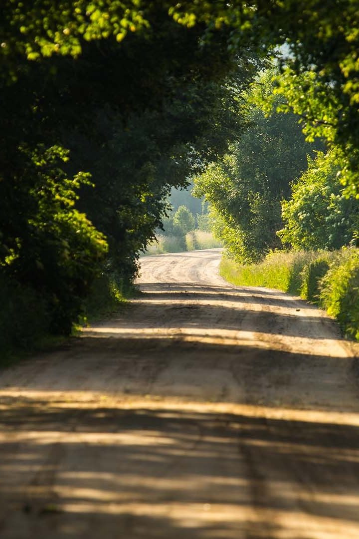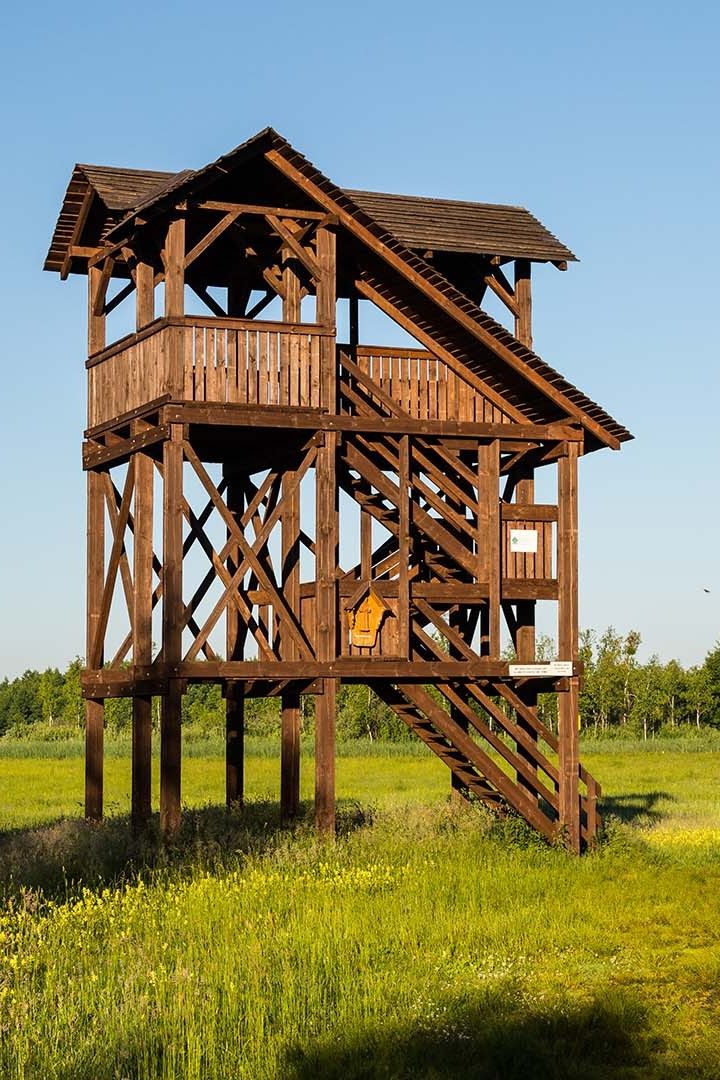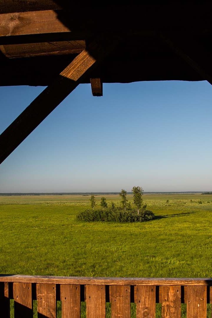 Wracając do Carskiej Drogi – początkowo prowadzi przez las, aż do pól w Brzezinach. Musicie zachować ostrożność i jechać zgodnie z przepisami przez wzgląd na łosie, które często można tu spotkać. Jazda, nawet w tempie 30–40 km/h, sprawia ogromną frajdę – wokół tylko las i śpiew ptaków. W kilku miejscach wyznaczono punkty widokowe. Z wieży ujrzycie bagna, gdzie zamontowano kładkę – Długą Lukę.